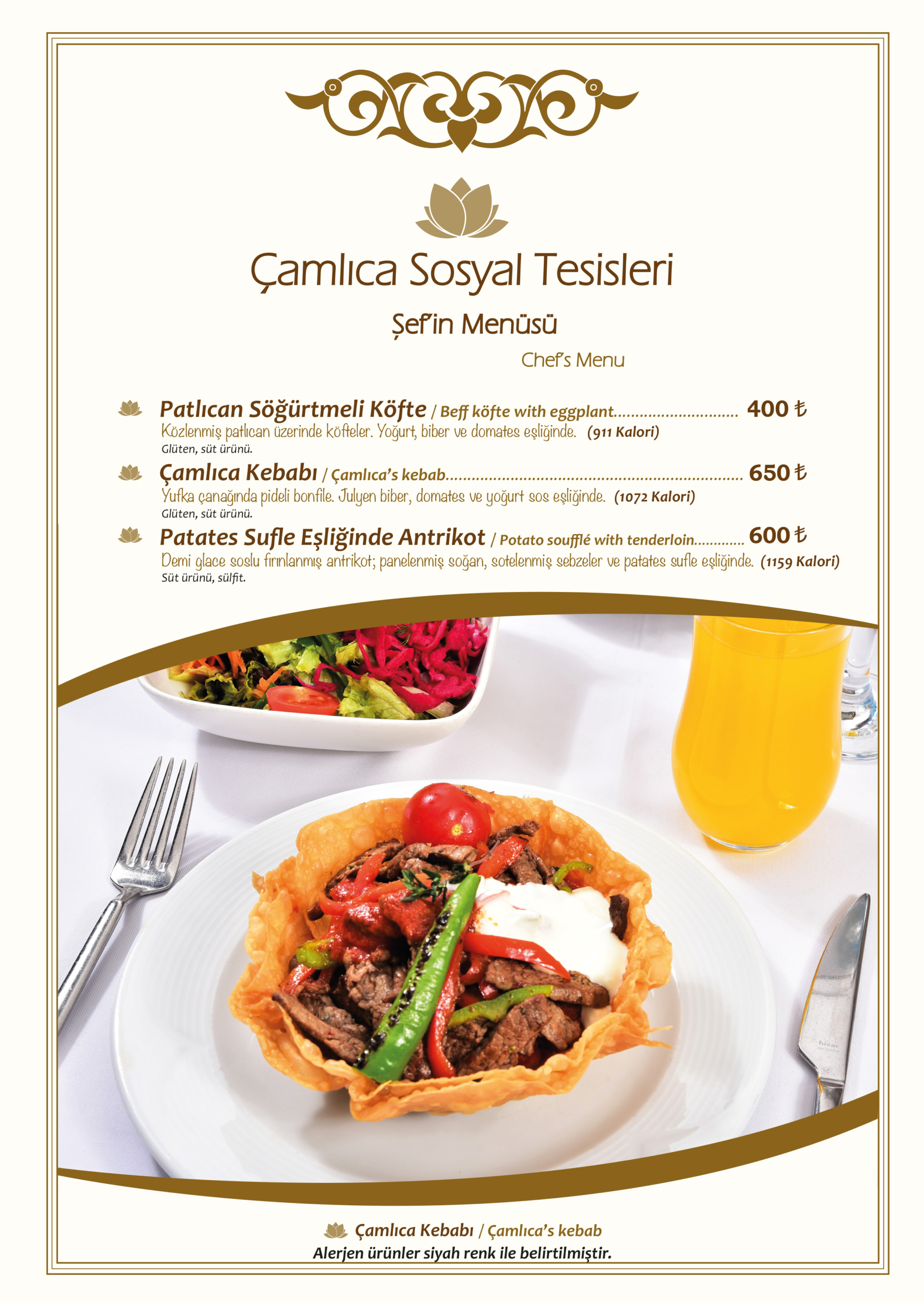 Çamlıca Sosyal Tesisleri’nin sipesiyallerini ise ızgarada pişirilmiş köftelerin patlıcanlar ile birlikte sıra sıra dizilerek servis edildiği Köfteli Patlıcan Söğürtme ve piliç kıymasının sebzelerle sotelenerek açılan bonfile ile rulo şeklinde sarılıp ızgarada pişirilmesiyle elde edilen Sebze ile Doldurulmuş Bonfile oluşturuyor.
