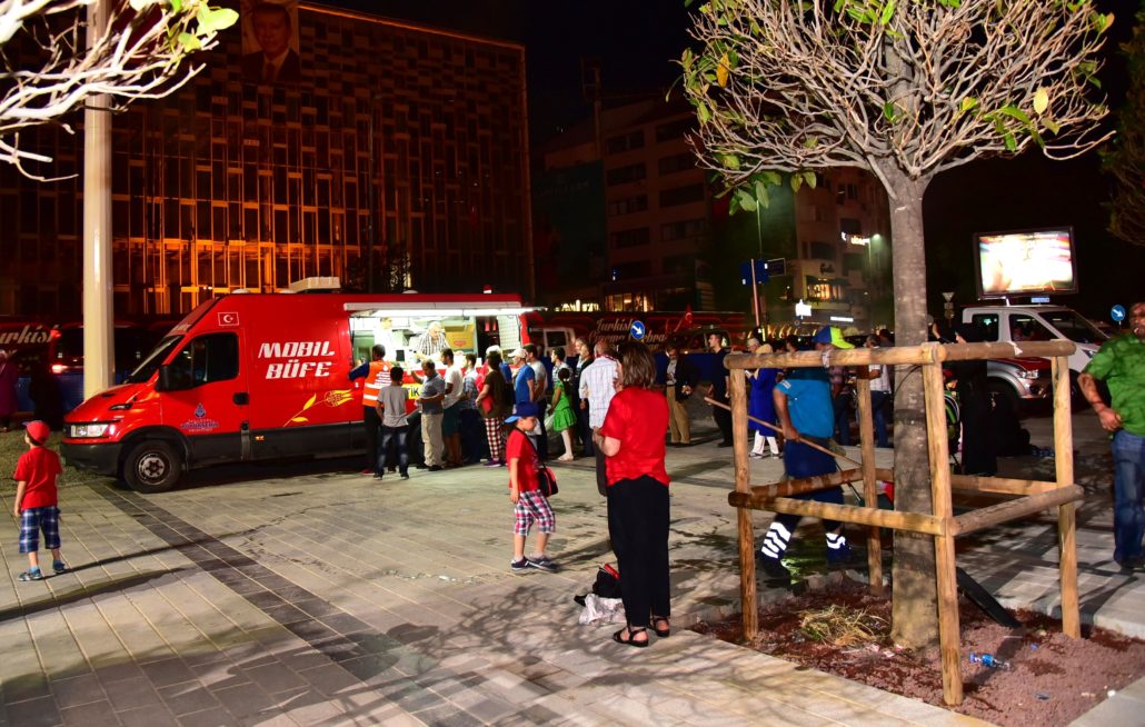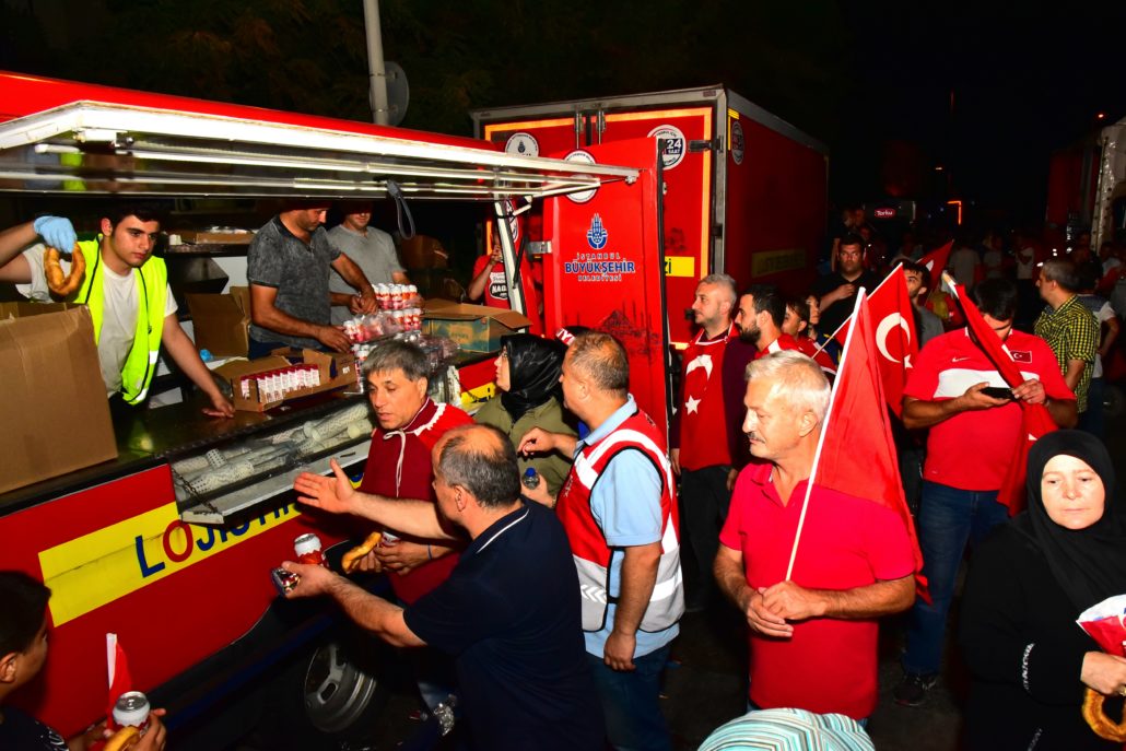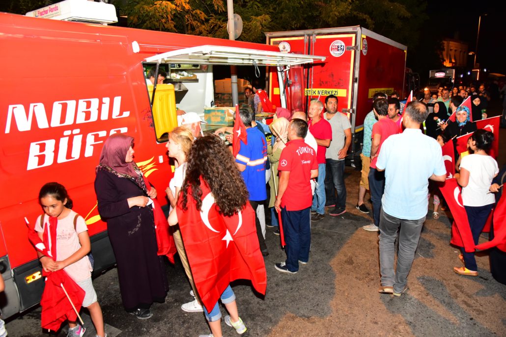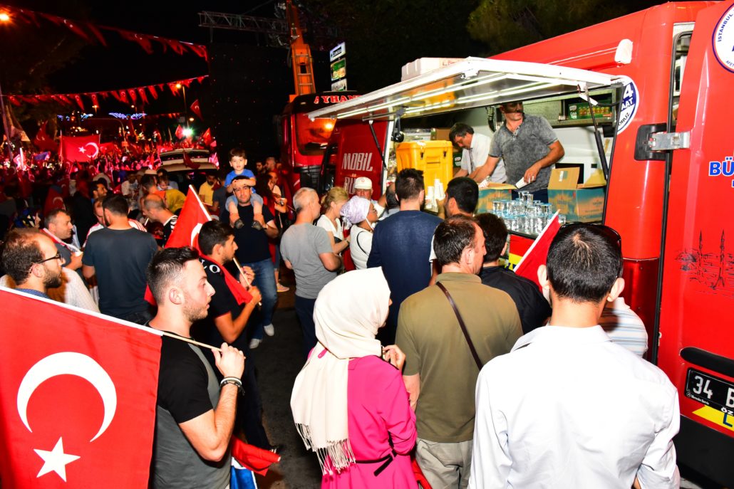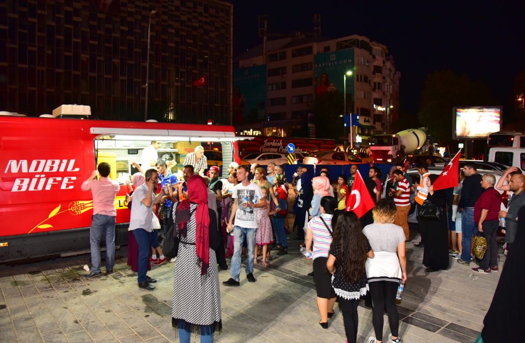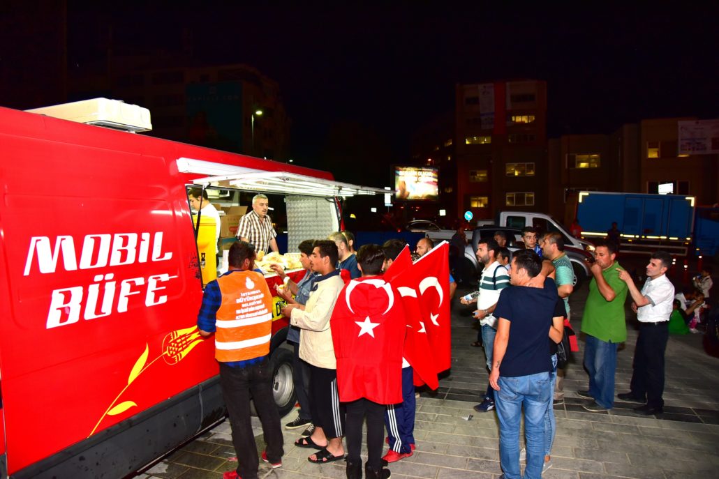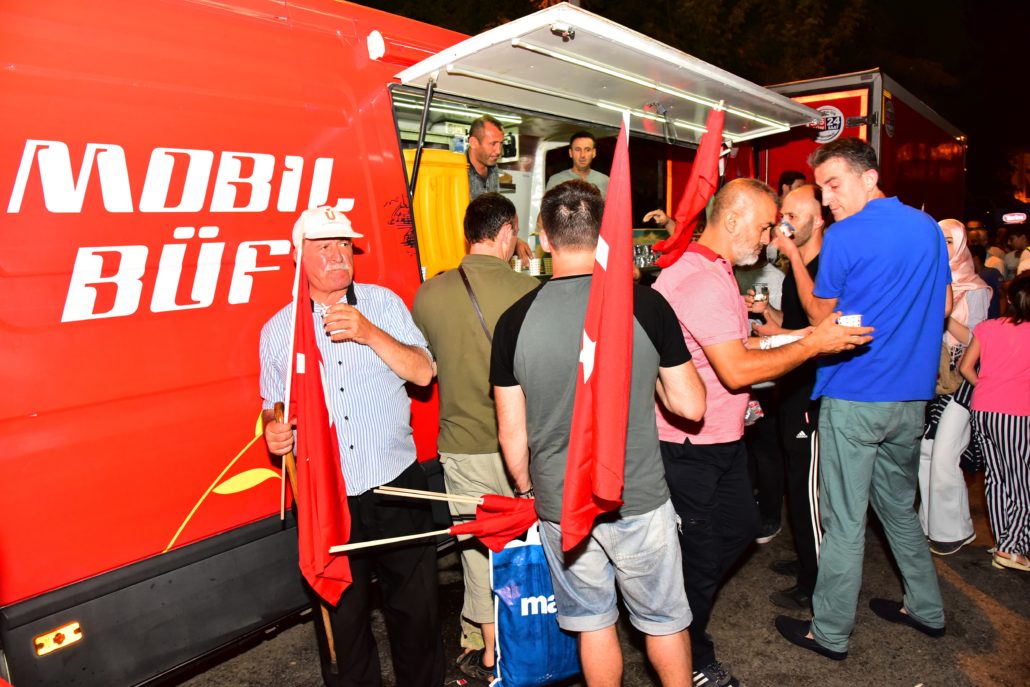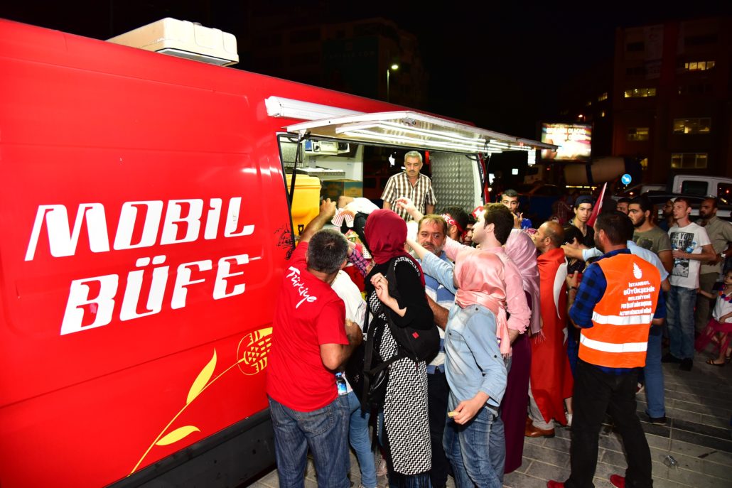 Her biri ortalama 2 bin kişi kapasiteli 7 adet Mobil Büfe, halkın en yoğun şekilde toplanarak birlik ve beraberlik mesajları verdiği Kısıklı, Kartal, Atatürk Havaalanı, Vatan Caddesi, Taksim Meydanı, Sütlüce ve Saraçhane’de 24 saat boyunca halkla birlikte nöbet tutuyor. Başta su, çay ve çorba olmak üzere çeşitli ikramlarda (konserve, sandviç, kek, ekmek, meyve suyu vb.) bulunan İBB Mobil Büfeler, halkın gıda gereksinimlerinde yerinde çözüm üretiyor.