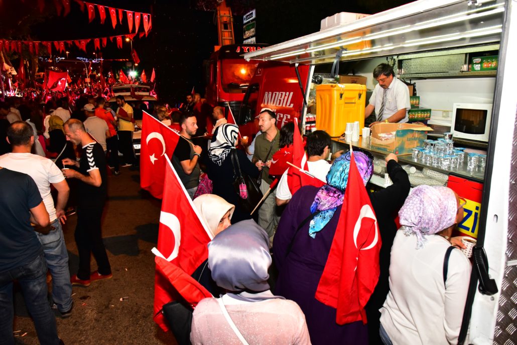 İstanbul Büyükşehir Belediyesi, sabit noktaların yanı sıra İstanbul’un tüm ilçelerinde demokrasi nöbeti, tutan halka da hizmet götürüyor. 3 adet Mobil Büfe ve 6 adet Panelvan 24 saat boyunca ilçe ilçe gezerek gerek sivil halka, gerek belediye birimlerine gerekse emniyet mensuplarına ikramlarda bulunarak destek sağlıyor.