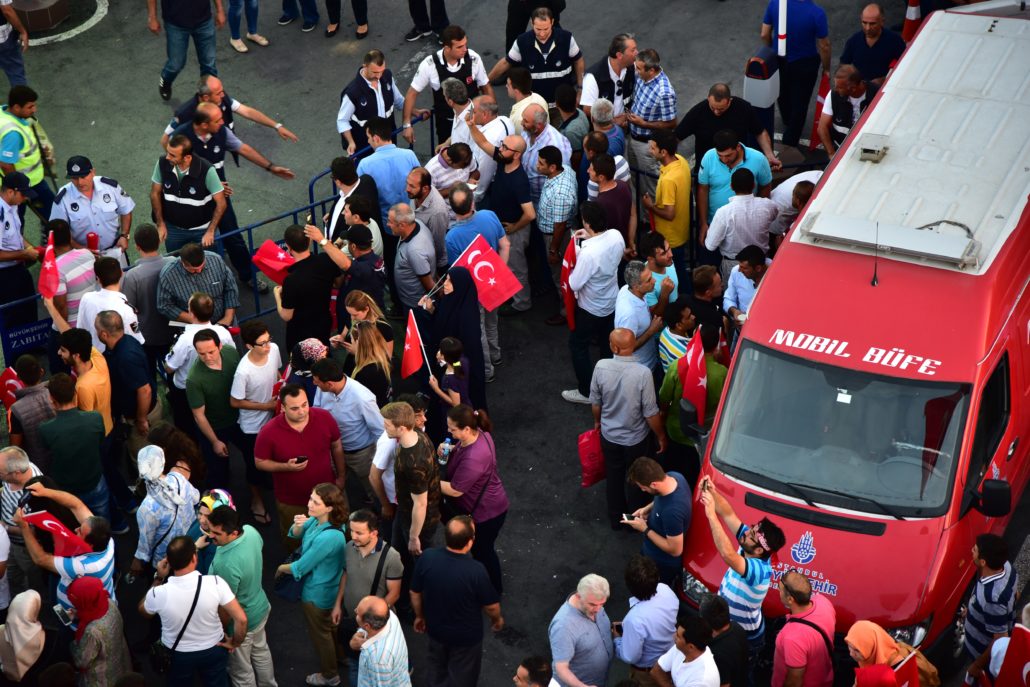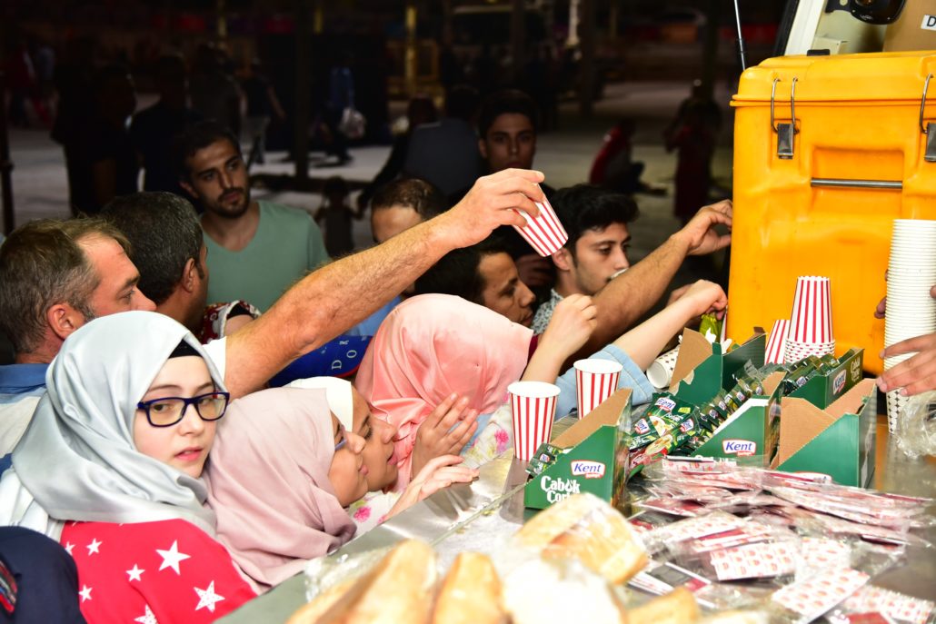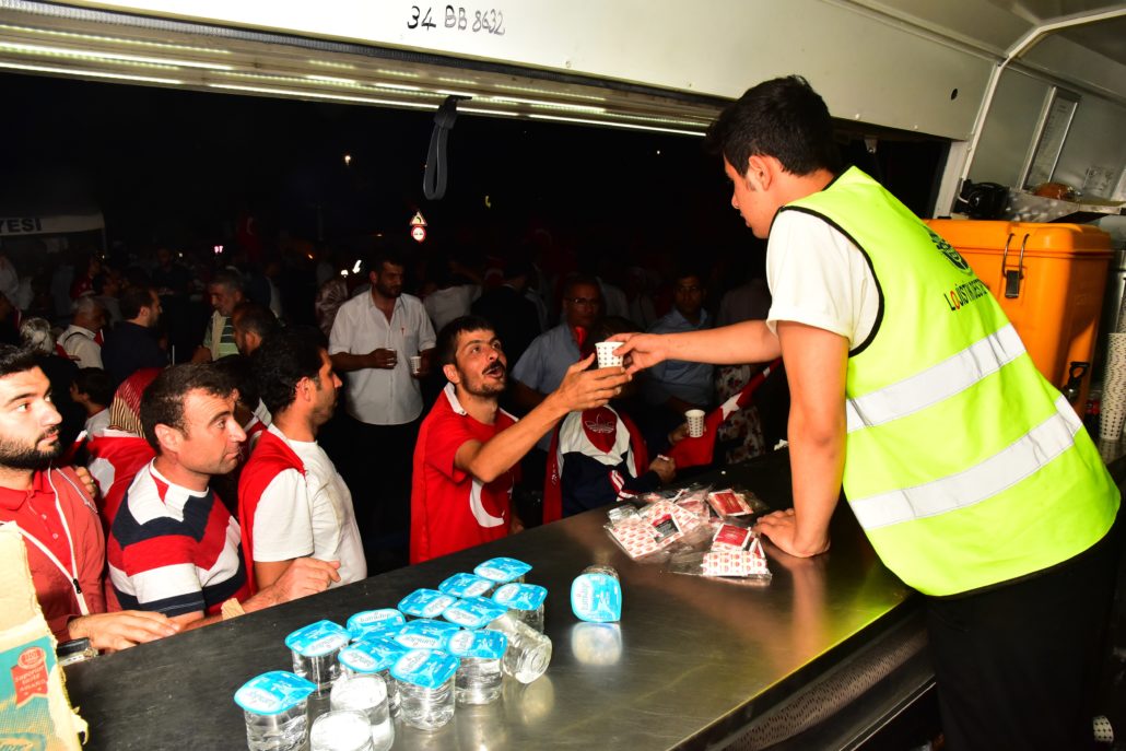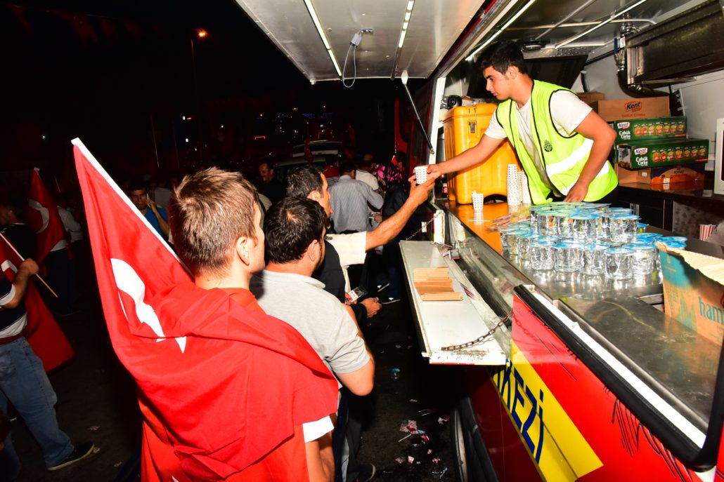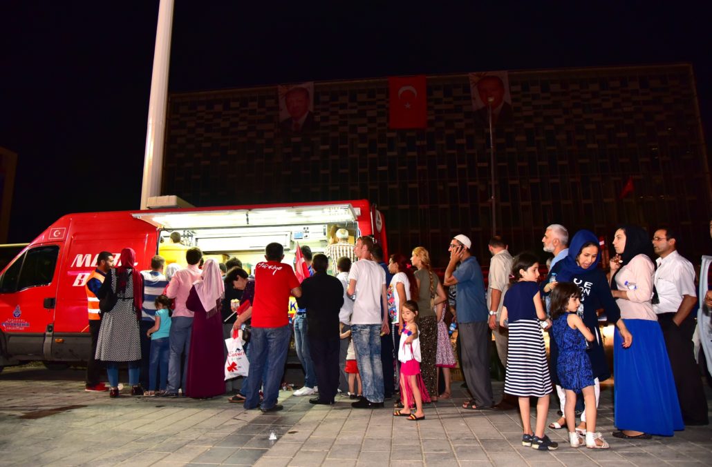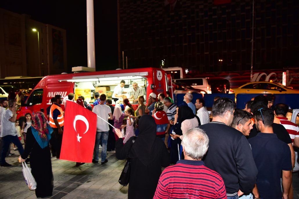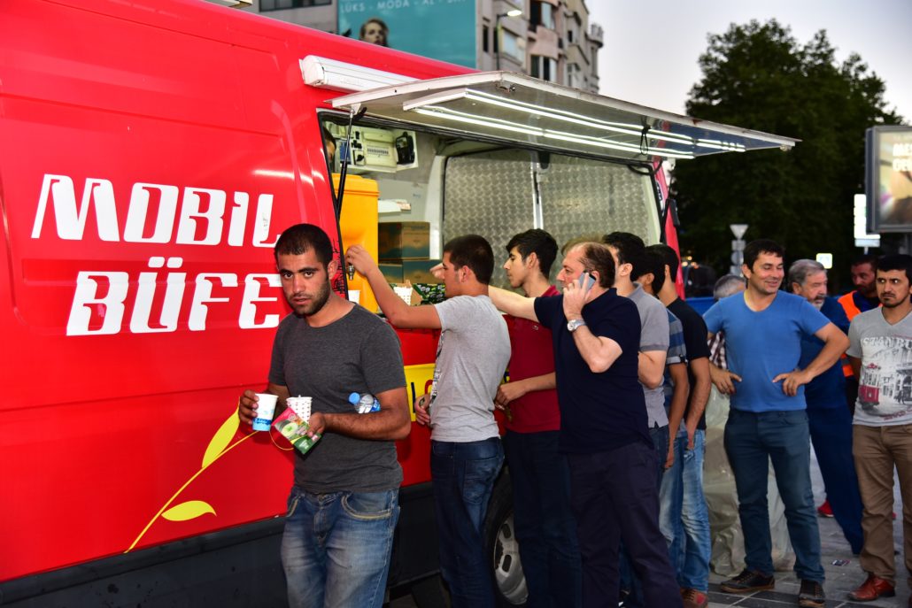 Gerçekleştirilen hain darbe girişimine karşı 15 Temmuz gecesinden itibaren İstanbul’un en kritik merkez, cadde ve sokaklarında demokrasi nöbeti tutan genci, yaşlısı, kadını ve çocuğu ile yüz binlerce İstanbullunun acil gıda gereksinimleri İBB Mobil Büfeler aracılığı ile sağlanıyor.
