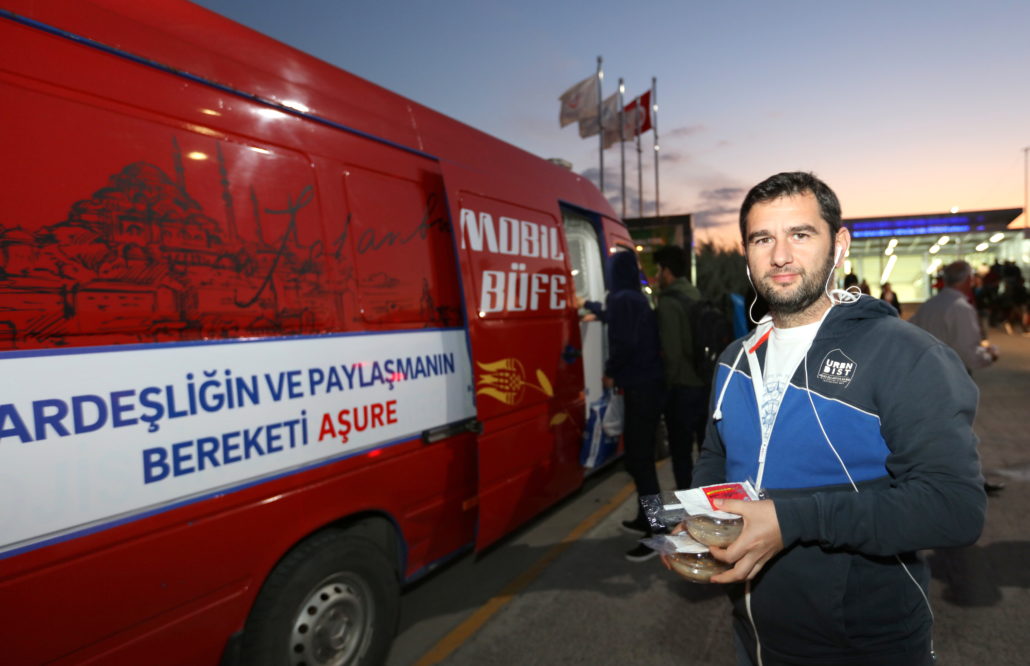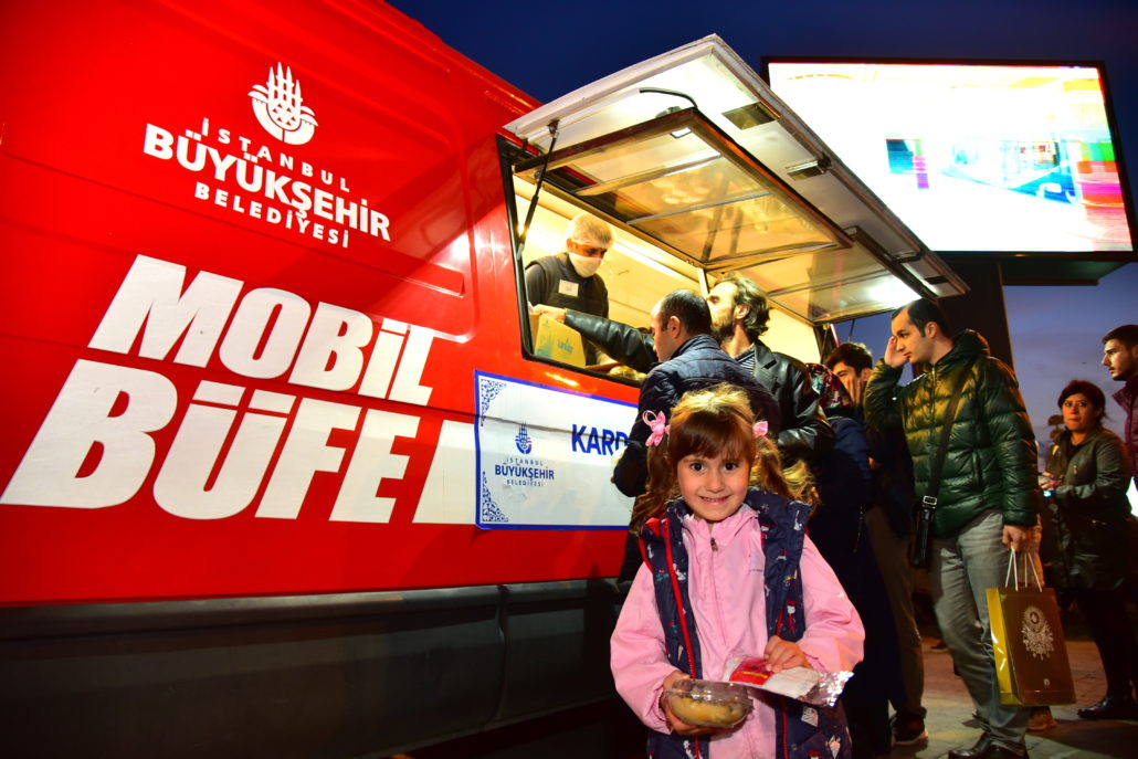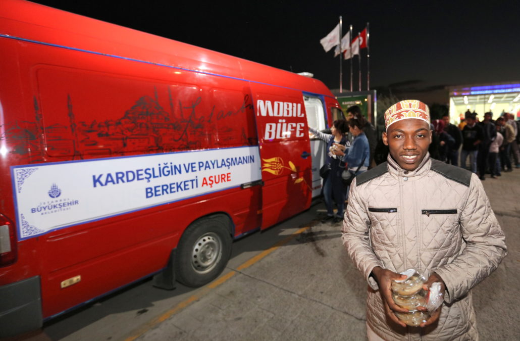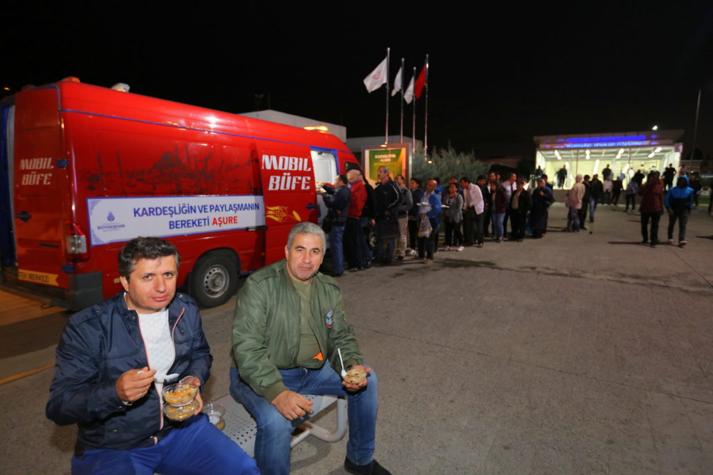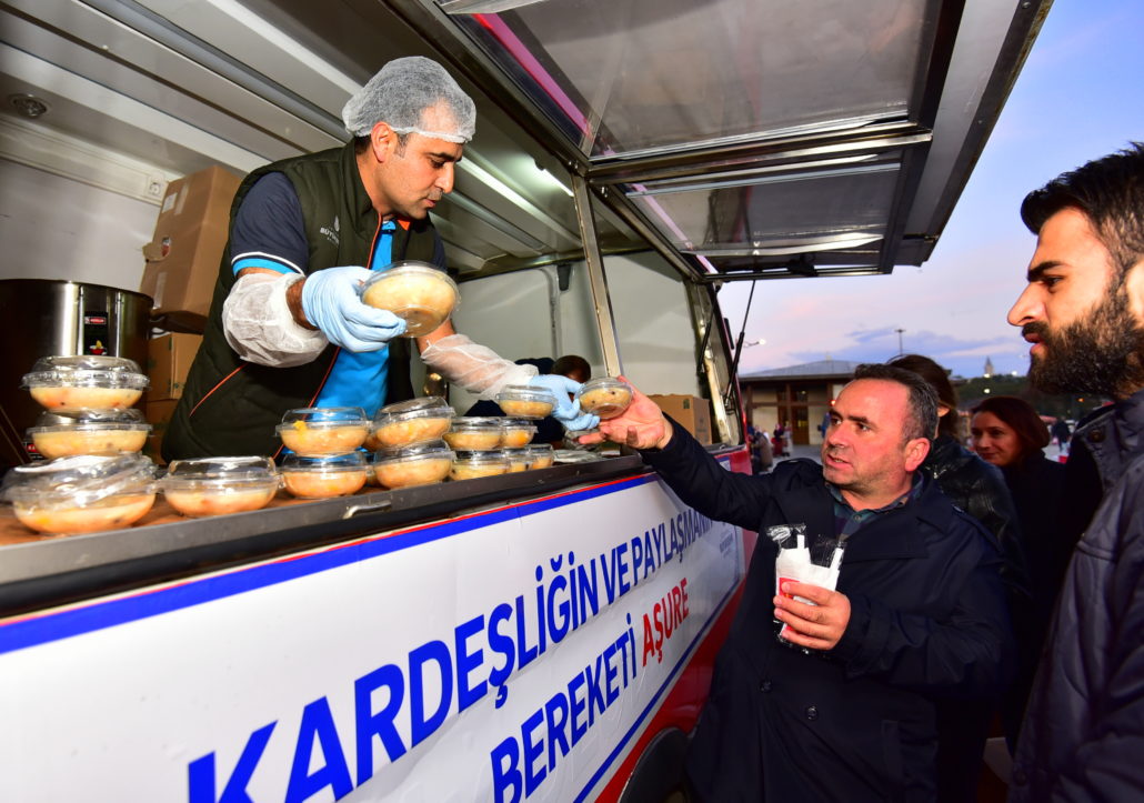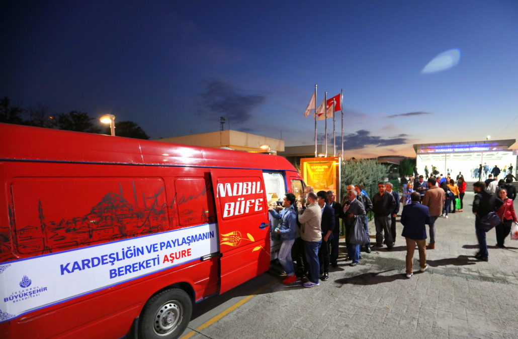 Olağanüstü durumlarda İstanbulluların gıda gereksinimlerine acil çözümler sunan Mobil Büfeler bu defa paylaşmanın simgesi Aşure dağıtımı için yollardaydı. İstanbul’un en hareketli noktalarından Yenikapı ve Üsküdar Marmaray çıkışları, Eminönü ve Beşiktaş İskeleleri ile Şişli Meydanı ve Mecidiyeköy Metrobüs Durağı’nda konumlandırılan Mobil Büfeler sayesinde kısa sürede binlerce aşure vatandaşlara ikram edildi. Ayrıca çeşitli ilçelerde kurulan 30 İBB İletişim Noktası’nda da vatandaşlar aşurelerle karşılandı.