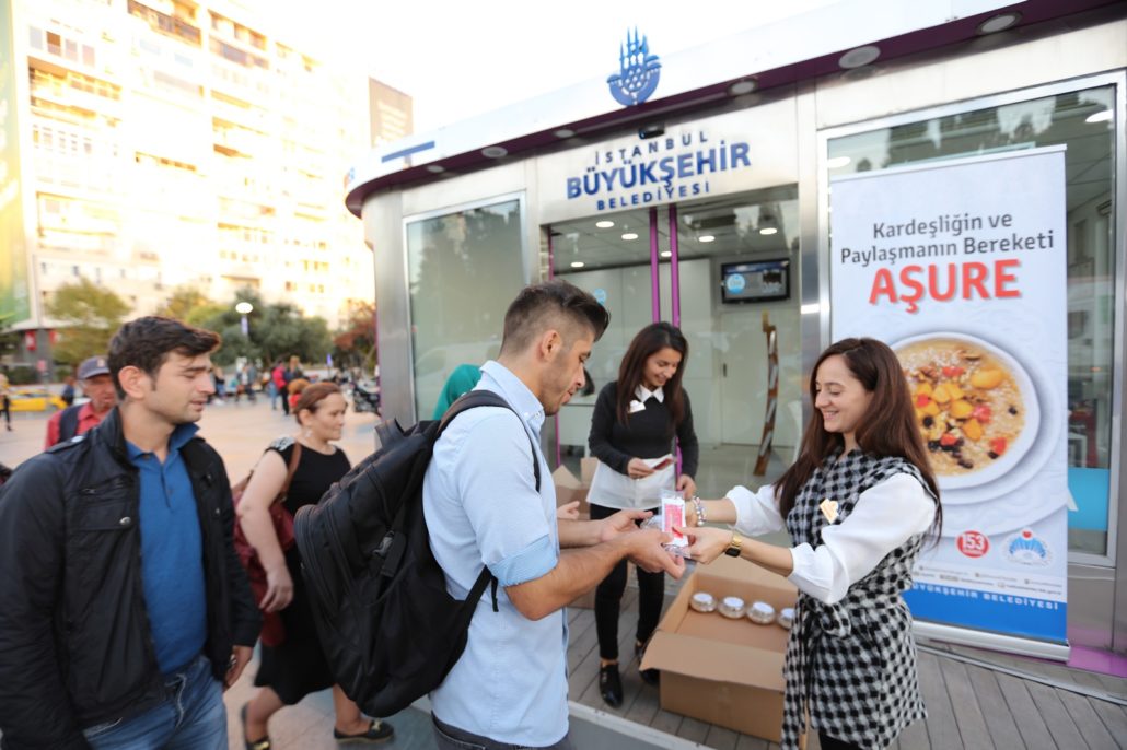 İstanbul Büyükşehir Belediyesi, halk arasında dayanışma, paylaşma, muhabbet, birlik ve beraberliğin simgesi haline gelen Aşure Günü vesilesiyle binlerce kişiye aşure dağıttı. Lojistik Destek Merkezi’nin dev mutfaklarında 7 ton malzeme kullanılarak hazırlanan 100 bin kişilik aşure, İstanbul’un Anadolu ve Avrupa yakasında 20 farklı noktada ve tüm İBB Sosyal Tesisleri’nde ücretsiz olarak ikram edildi.