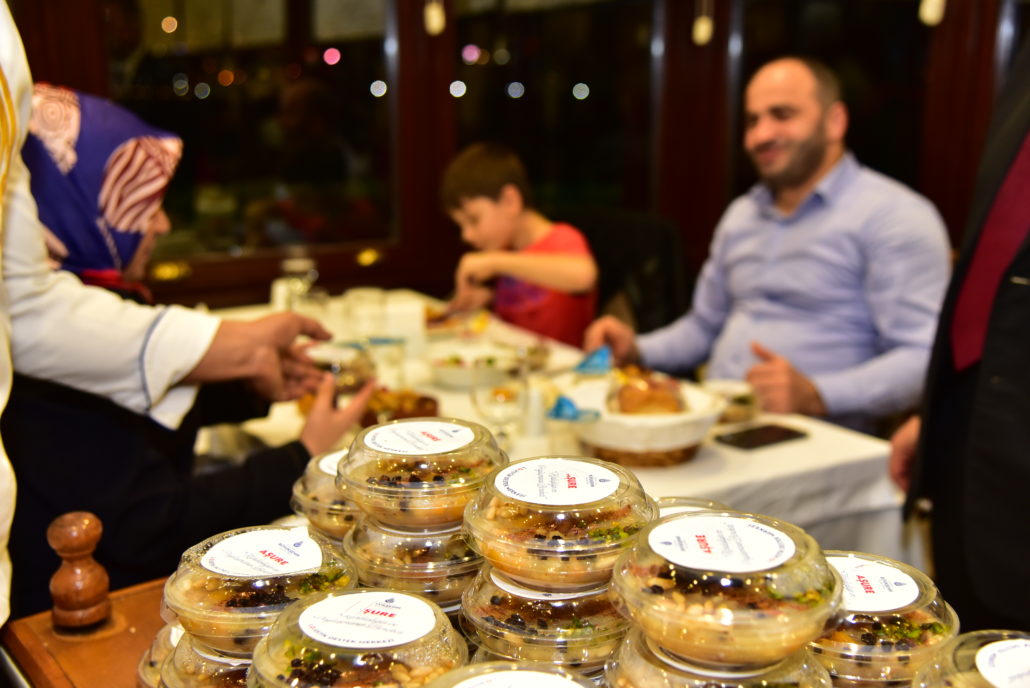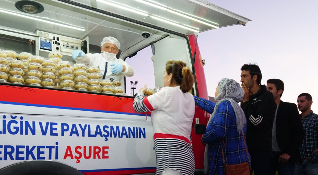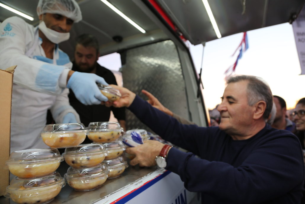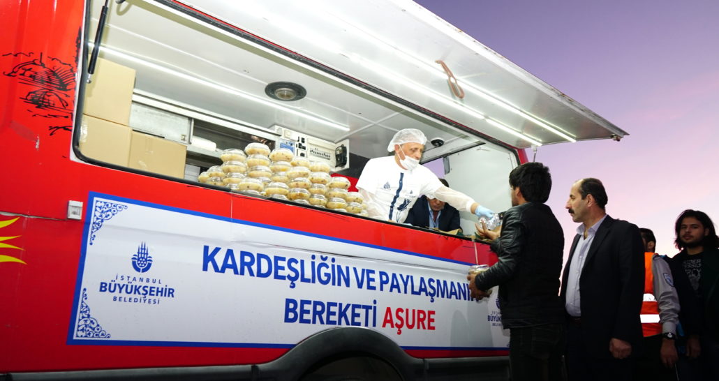 Akşam saat 18.30 itibari ile İstanbul’un meydanları, İskeleler ile halkın yoğun olarak bulunduğu noktalarda servis edilen aşureler, 7 gün 24 saat esasıyla İstanbul için hizmet üreten Lojistik Destek Merkezi mutfaklarında özenle hazırlandı. Aşureler yine İBB Lojistik Destek Merkezi’nin pratik hizmet araçları olan Mobil Büfeler ve Alo 153 Beyaz Masa mobil ekip araçları ile dağıtıldı.