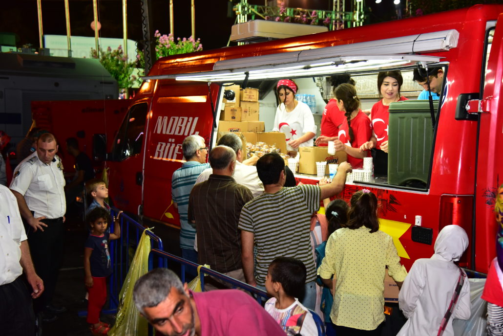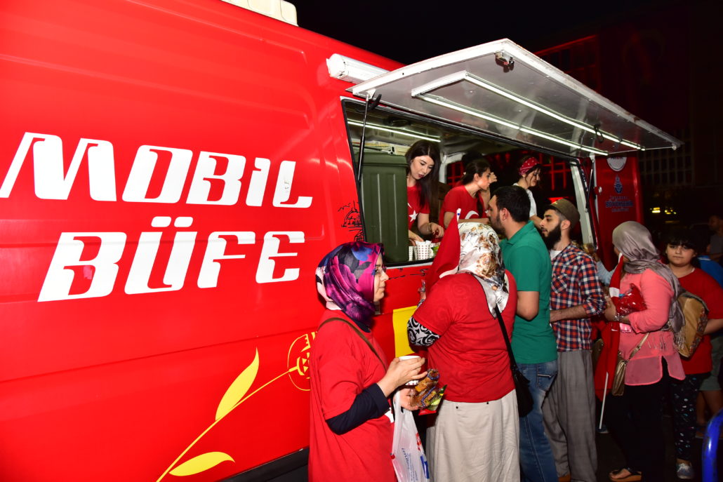 Başta 15 Temmuz Şehitler Köprüsü olmak üzere Kısıklı, Saraçhane, Çengelköy, Taksim, Bakırköy, Kadıköy, Kartal, Maltepe, Sarıyer, Şişli, Avcılar, Beylikdüzü, Silivri ve Çatalca’da konumlandırılan Mobil Büfeler, 15 Temmuz akşamı saat 18.30’dan başlayarak Pazar gecesi saat 24.00’a kadar programlara katılan tüm halka kumanya ve içecek dağıtımı yapacak.
