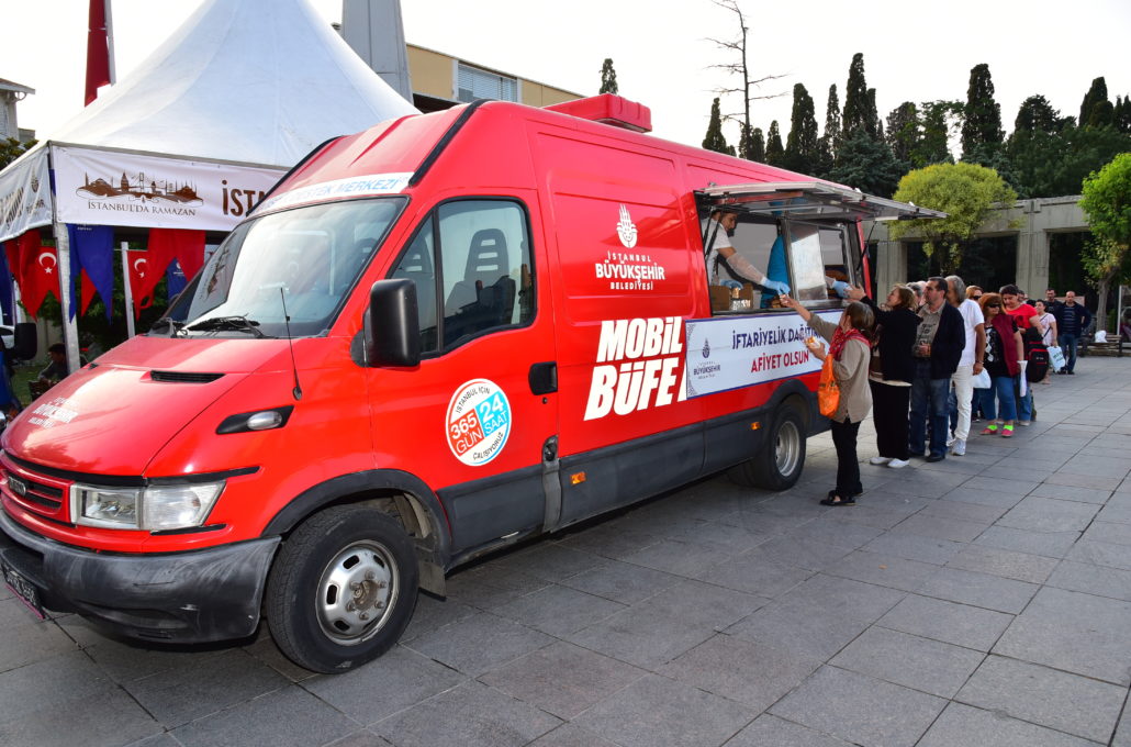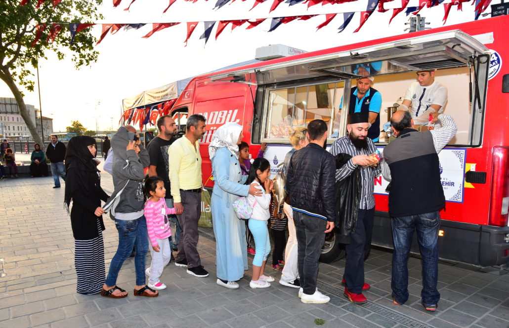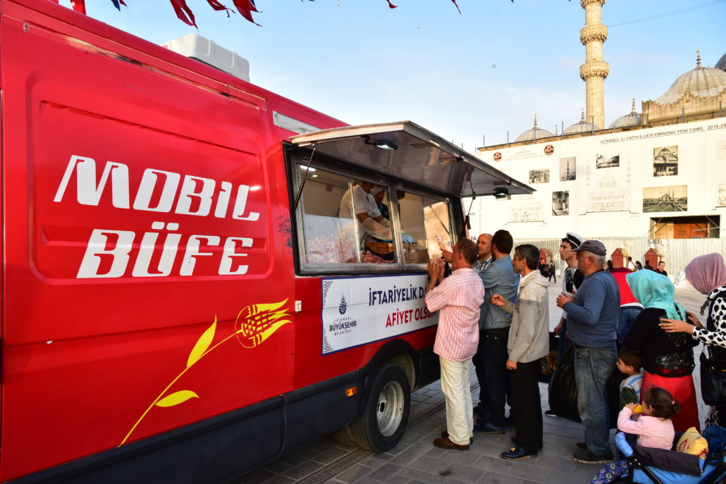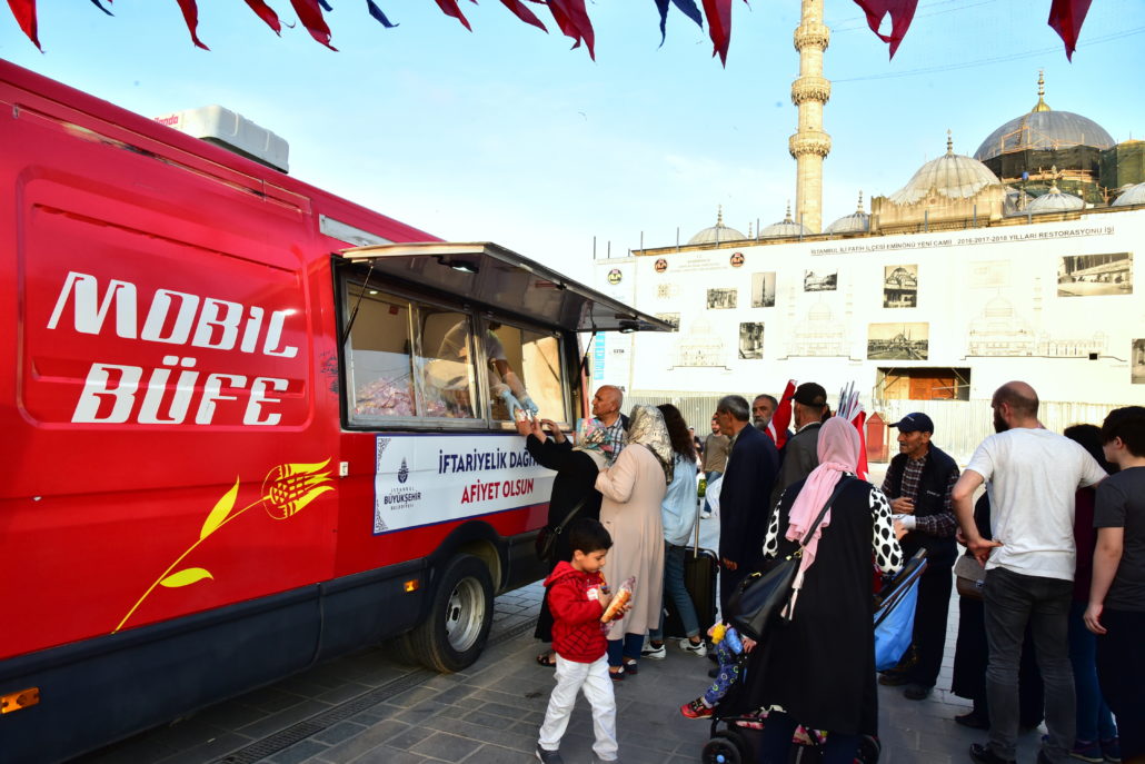 İstanbul Büyükşehir Belediyesi’nin pratik hizmet araçları Mobil Büfeler, ihtiyaç duyulan her noktada hizmet sunmaya devam ediyor. İstanbul’un en merkezi yerlerinden Kadıköy, Eminönü ve Bakırköy Meydanları ile Şişli Camii önünde konumlandırılan Mobil Büfeler, Ramazan ayı boyunca çeşitli nedenlerle evlerine yetişemeyen İstanbullulara iftariyelik dağıtıyor.